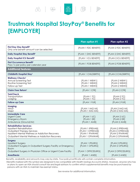 Displays benefit amounts for 1-2 HSP plans. Fully customized to each case offering. Can pair with the HSP 1-pager. Order via your Trustmark contact. (Not filed in NM.)
