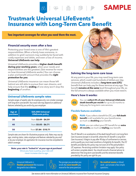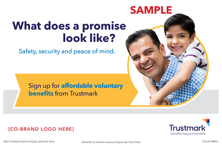Durable and business-card sized; can be provided right after enrollment to new policyholders. Welcomes them and contains Trustmark contact info for policy questions and claims.