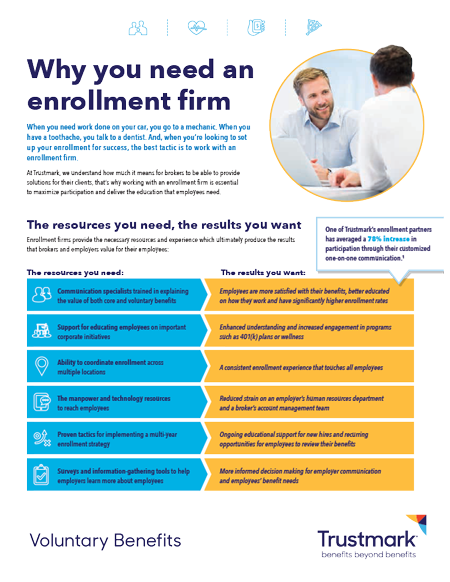 Demonstrates to brokers the value that working with an enrollment firm brings to an enrollment. Can be printed or emailed digitally.