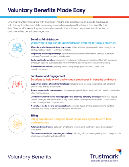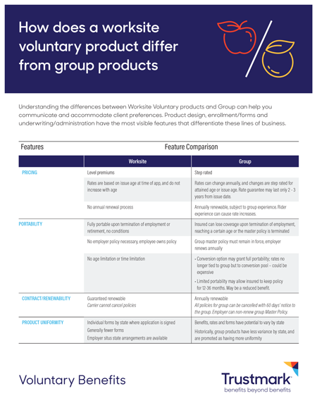 A comparison of worksite voluntary and group voluntary products. Can be printed or shared digitally.