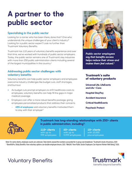A slick that outlines Trustmark’s expertise in handling cases in the public sector. Can be emailed digitally or printed and handed out.