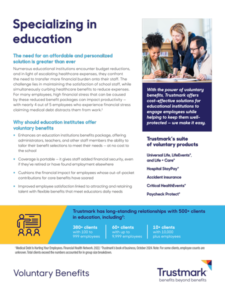 A slick that outlines Trustmark’s expertise in handling cases in the education industry. Can be emailed digitally or printed and handed out.