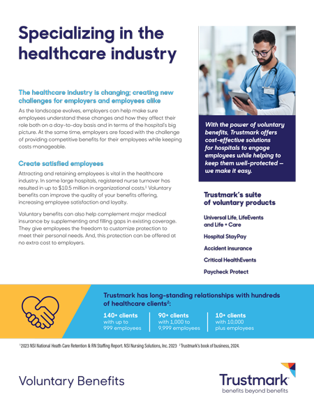 A slick that outlines Trustmark’s expertise in handling cases in the healthcare industry. Can be emailed digitally or printed and handed out.