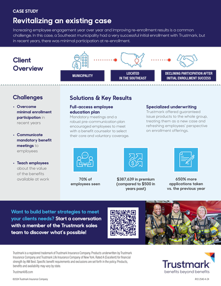 Show how a Trustmark can use re-enrollment to drive new revenue from an existing case. Can be a printed leave behind or shared digitally.