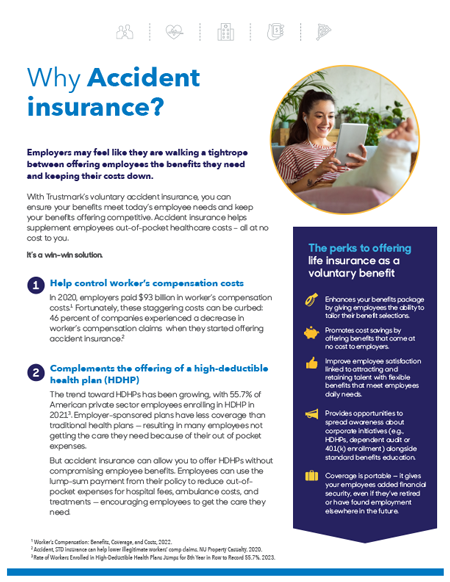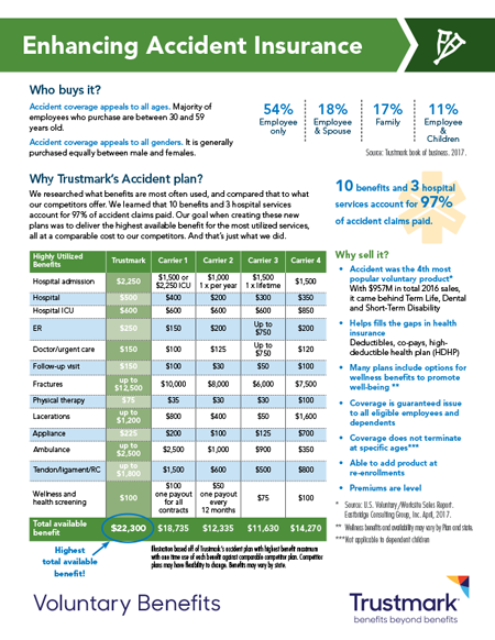 A printable or email-able document that demonstrates the need for Accident insurance and Trustmark’s productto brokers and employers. Can be emailed or printed and shared.