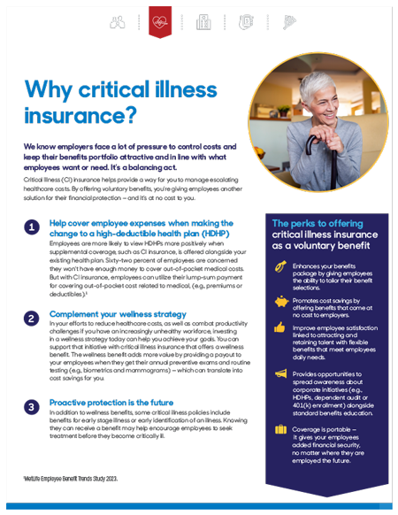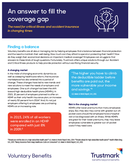 Demonstrates how Critical illness and accident are an important tool to help fill gaps in high-deductible health plans. Can be emailed or printed and shared.